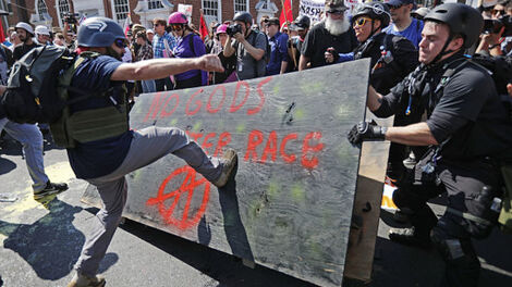 Pause. Here goes that false equivalence again. Who has been violent to the white nationalists?